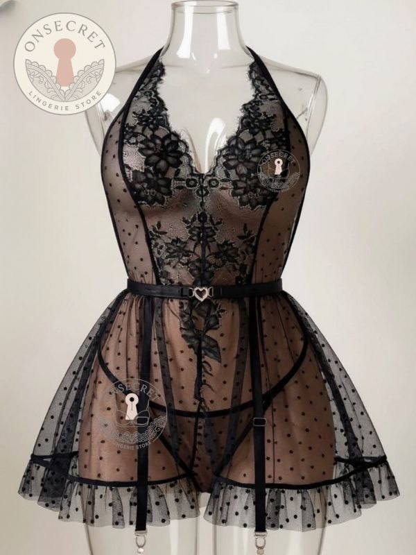 لباس خواب زنانه فانتزی جورابدار مدل پشت باز با تور خالدار نازک کد 3212