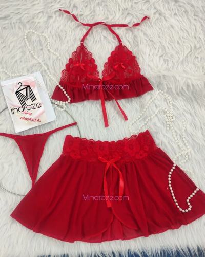 ست لباس زیر فانتزی زنانه ۳ تکه از جنس پارچه یاردی و گیپور کد 7025