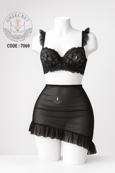 ناموجودست لباس زیر زنانه فانتزی دامنی فاق باز جوابدار فنردار جنس پارچه یاردی و گیپور کد 8009