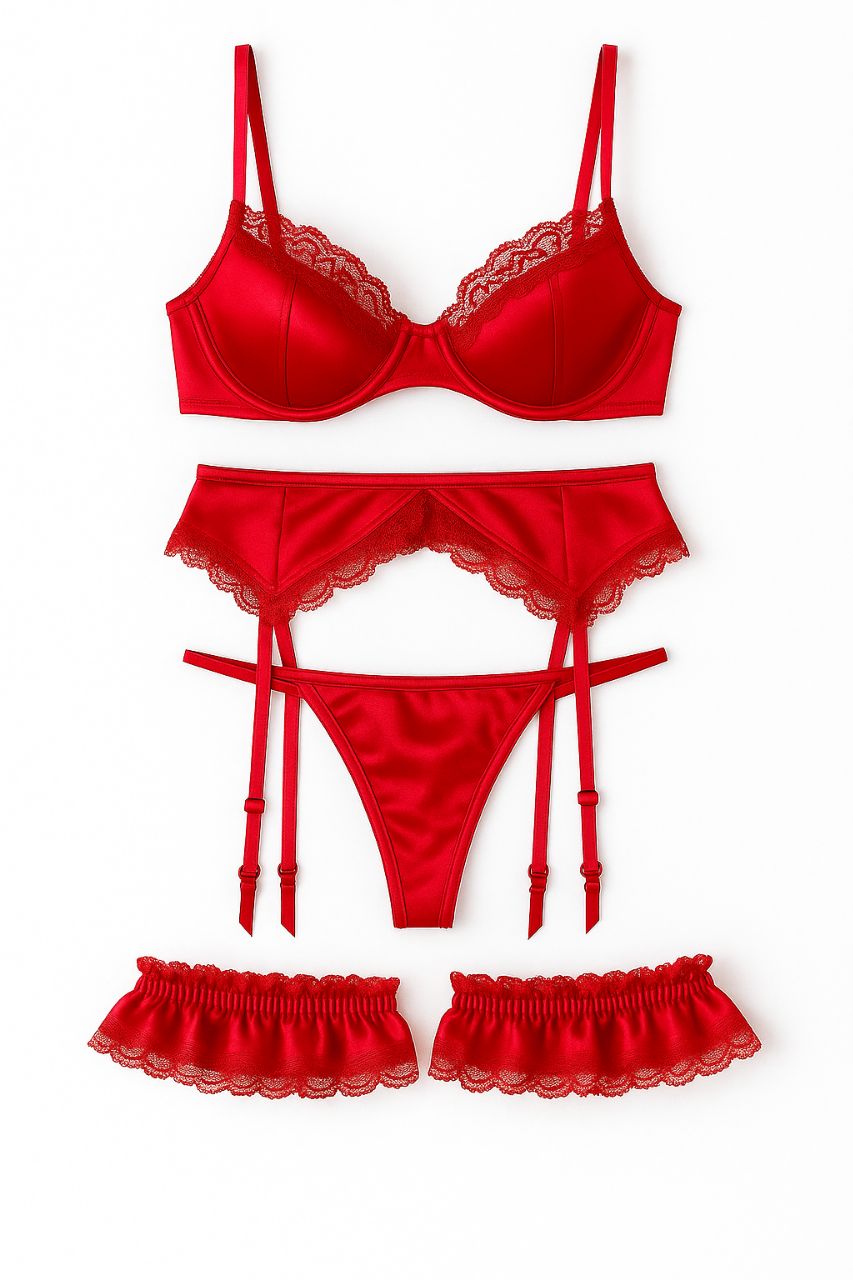 ست لباس زیر زنانه فانتزی ۴ تکه مدل فنردار ساتن و گیپور کد 1109