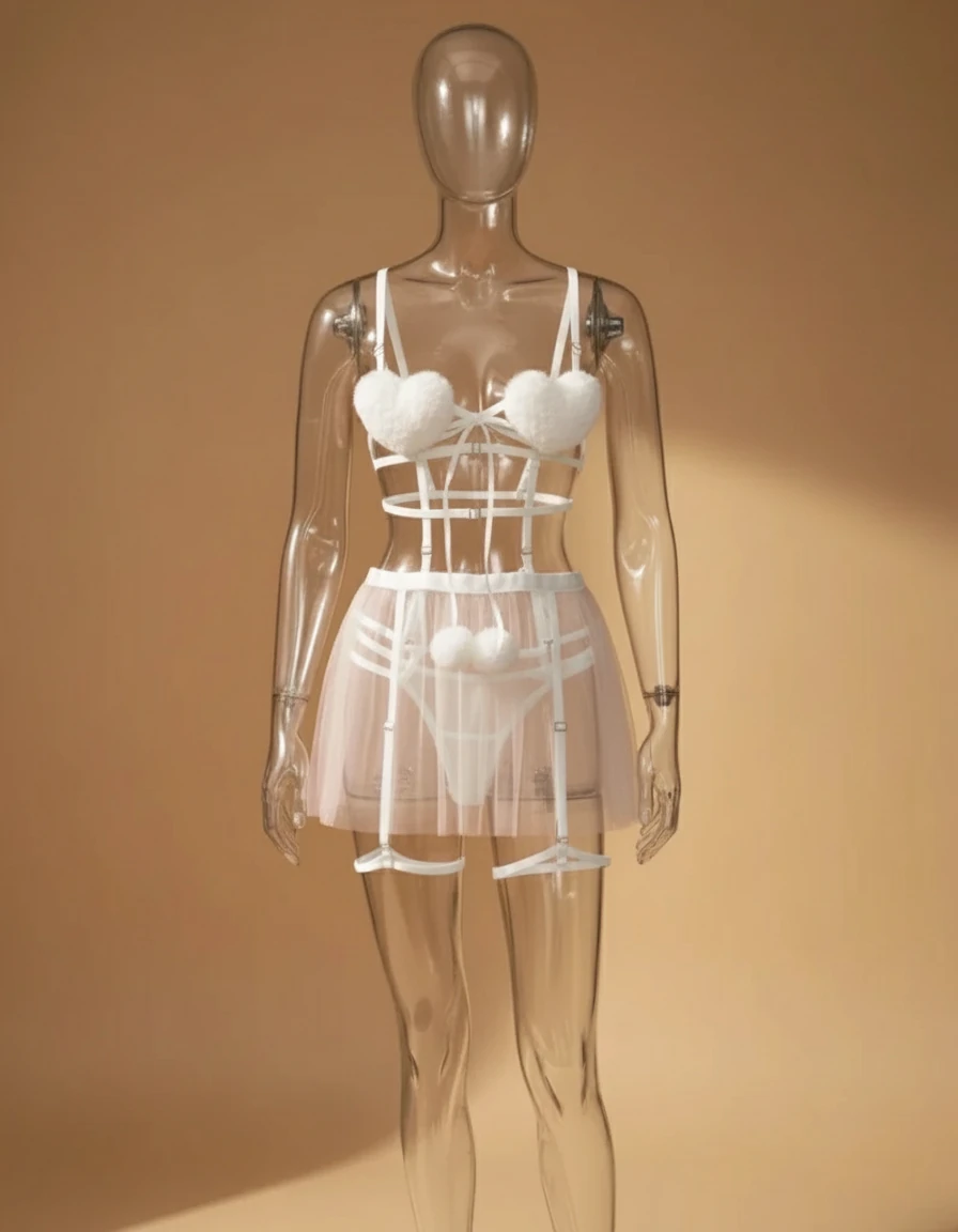 ست لباس زیر فانتزی تور شیشهای و پومپوم زنانه ۲ تکه کد 9015