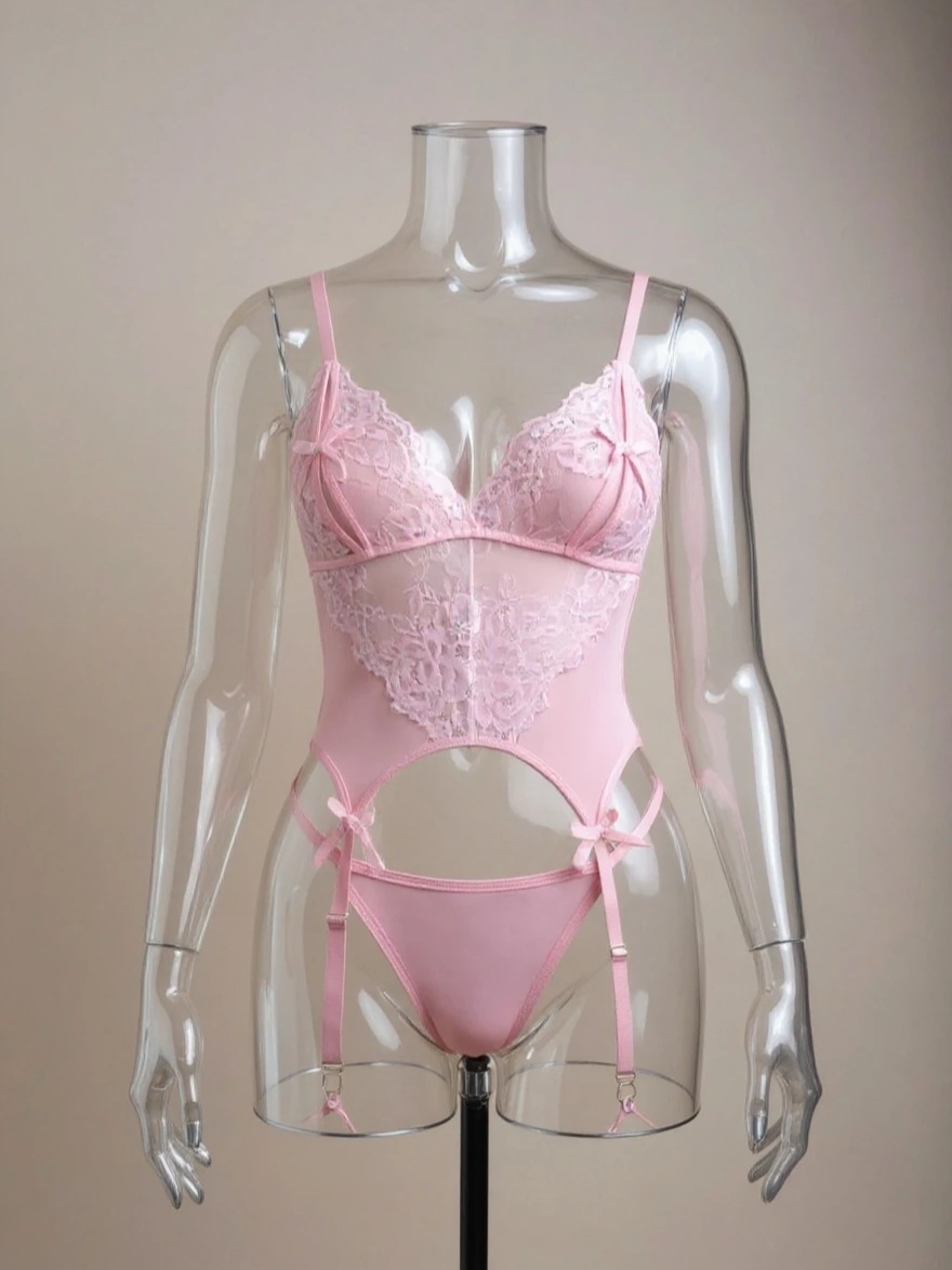 ست لباس زیر زنانه فانتزی ۴ تکه مدل شیشه ای فنردار و جورابدار کد 4185