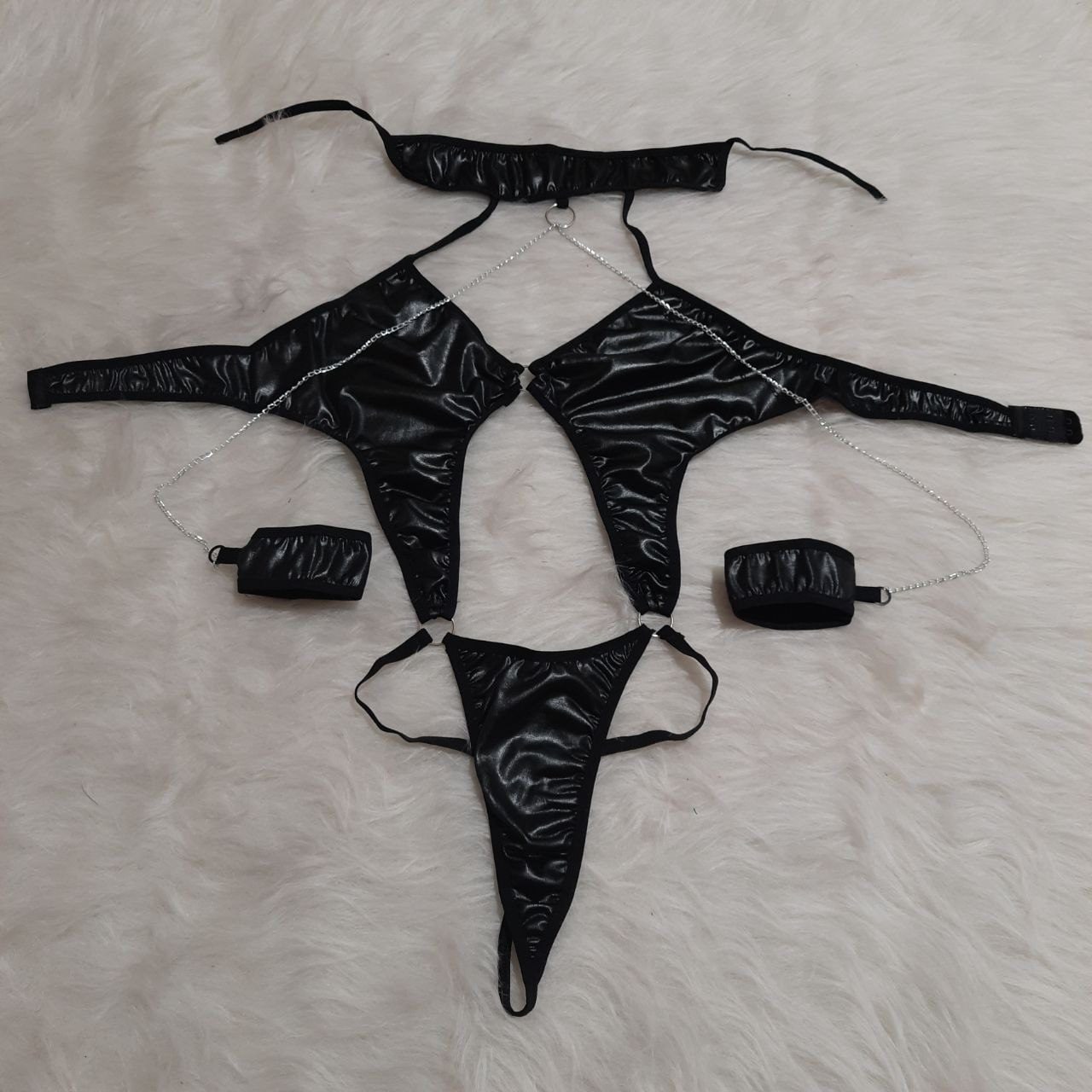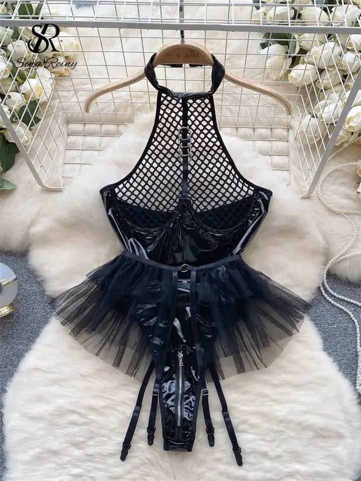 ست بادی زنانه فانتزی چرم و بند جوراب دامنی مدل فنردار و فاق زیپی یقه ایستاده کد 1046