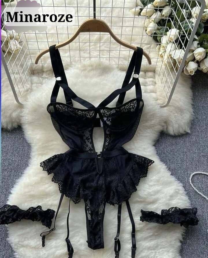 ست لباس زیر فانتزی زنانه فنردار مدل سینه باز همراه بندجوراب دامنی و جوراب کد M336
