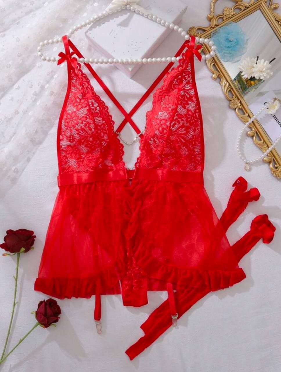 ست لباس زیر زنانه ۴ تکه فانتزی بند مروارید دار با جوراب زنبوری کد 0189