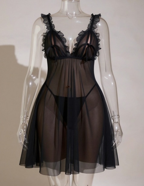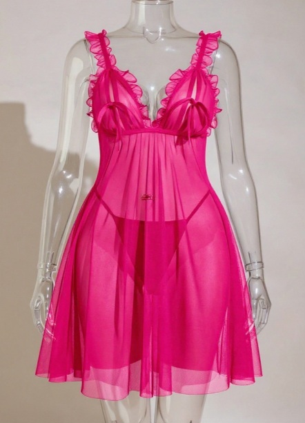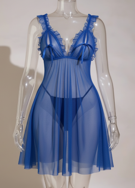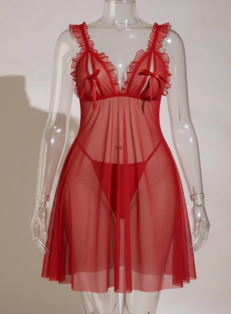 مدل لباس خواب: بند سرشانه چیندار، کاپ سینه چاکدار با بند گره ای، دامن کلوش، قد کار تا زیر باسن