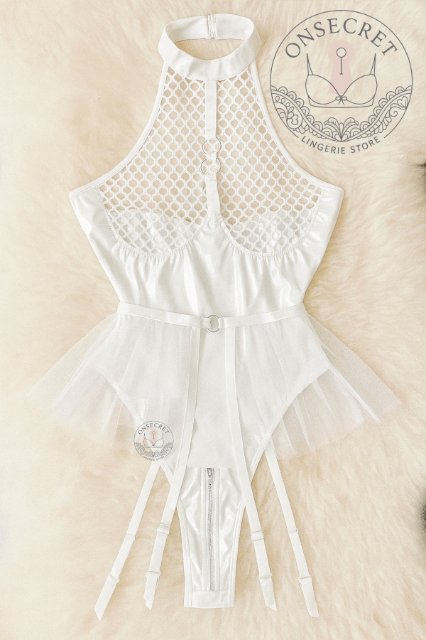 مدل بادی: یقه ایستاده، قسمت سینه و بالای سینه تور زنبوری، کاپ سینه فنردار، فاق قزندار زیپی