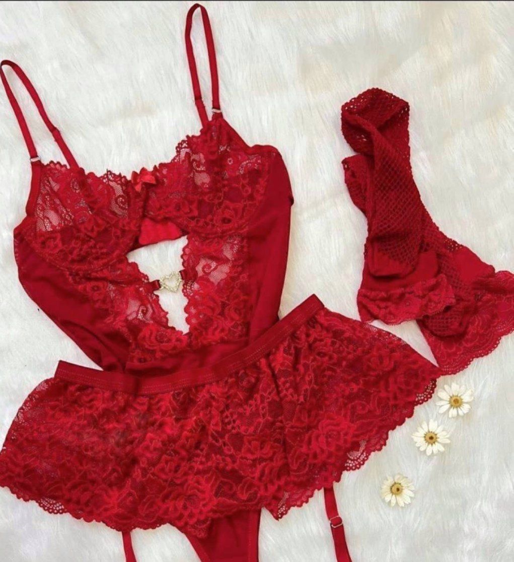 این ست لباس زیر زنانه فوقالعاده جذاب ۳ تکه شامل بادی فنردار و فاق باز، بند جوراب دامنی گیپور، جوراب ساق بلند زنبوری بالا تور دار با کد 8009 و رنگبندی سرخابی، قرمز، آبی، مشکی مناسب سایزبندی (۸۰-۸۵)L(۷۰-۷۵) ,XL میباشد.