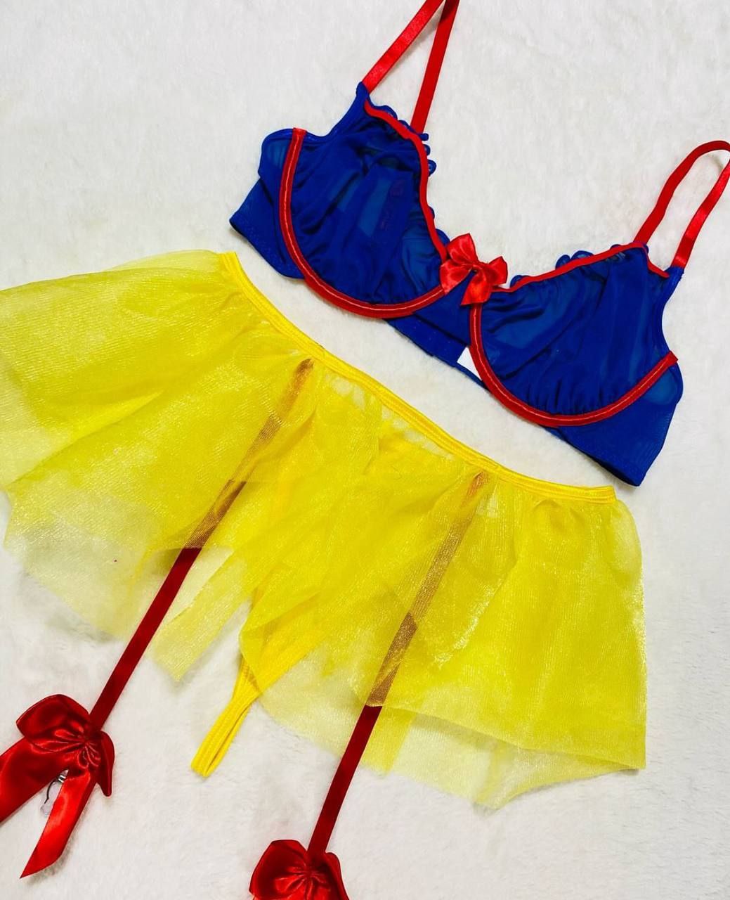 با ست فانتزی فنردار و جورابدار کد ۲۰۸۹، جذابیت و خاص بودن را تجربه می کنید. این ست الهامگرفته از شخصیتهای کارتونی، با ترکیب رنگهای آبی، قرمز و زرد، ظاهری کاملاً متفاوت و شاد ایجاد کرده است. شامل: سوتین فنردار با فرمدهی عالی و بندهای قرمز، شورت لامبادا با رنگ زرد زیبا و طراحی مینیمال، بند جوراب دامنی تور کوتاه سبک و جذاب و جوراب تور فیشنت قرمز جزئیات قابلتوجه در این ست: استفاده از پاپیونها و ترکیب متریال لطیف و باکیفیت جهت راحتی و زیبایی میباشد.