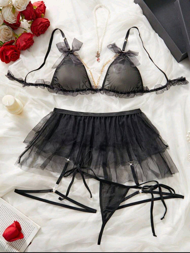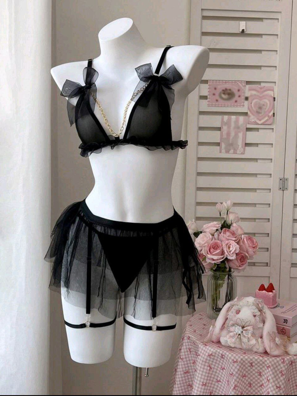 این ست لباس زیر فانتزی سهتکه شامل سوتین توری بدون فنر با طراحی جذاب و بندهای زینتی طلایی، شورت فانتزی بکلس و بند جوراب دامنی دلبریست که جلوهای مدرن و خاص به استایل شما میبخشد. دامن کوتاه از لایههای تور سبک و موجدار تهیه شده که بههمراه گارترهای قابل تنظیم، حس فانتزی و آزادی را به شما هدیه میدهد.