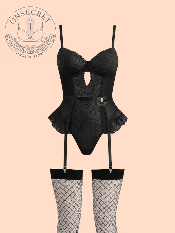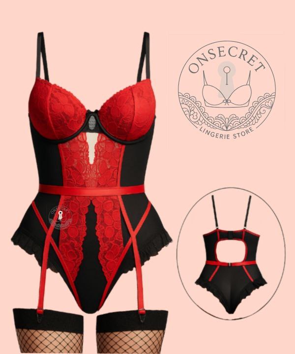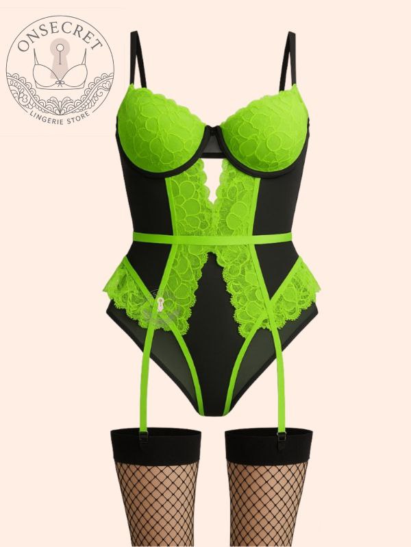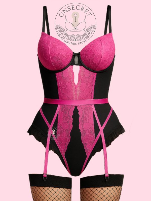 ست فانتزی فنردار جورابدار با ترکیب پارچه فیلامنت و دانتل گلدار، ظاهری جذاب و زنانه ایجاد میکند. طراحی برشدار در قسمت جلو با جوراب، استایلی اغواگر و چشمگیر به این ست میبخشد. وجود فنر در کاپها، فرمدهی و ساپورت عالی برای سینه را فراهم کرده و بندهای قابل تنظیم، فیت کامل روی بدن ایجاد میکنند. برای دیدن عکس تنخور اینجا کلیک کنید ((رنگ گیپور رنگهای صورتی و سبز از تصاویر کمرنگ تر است))