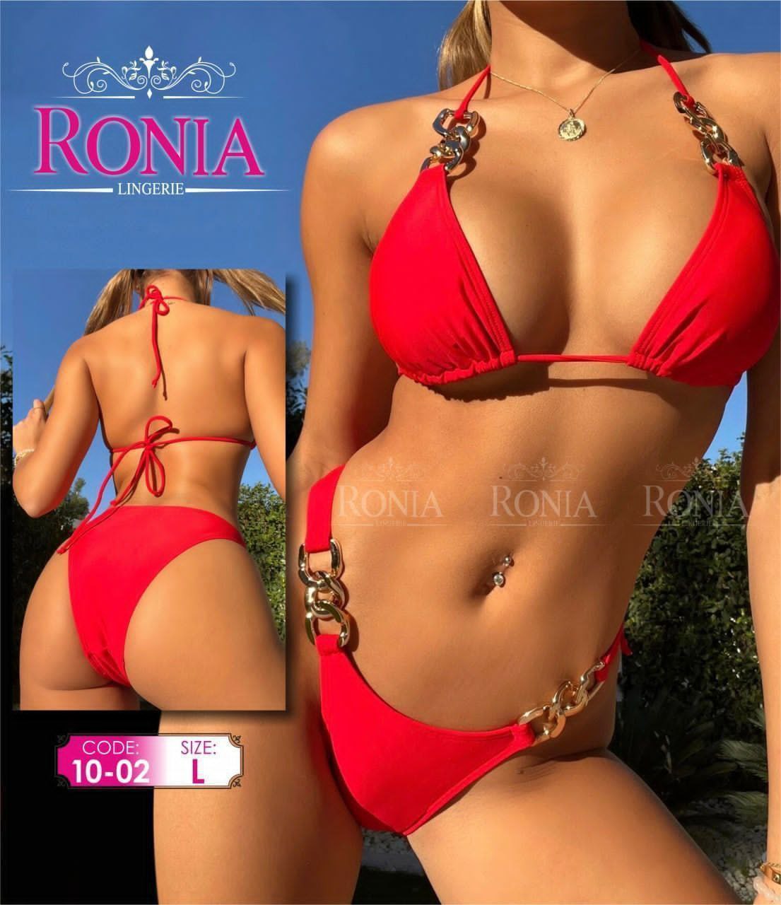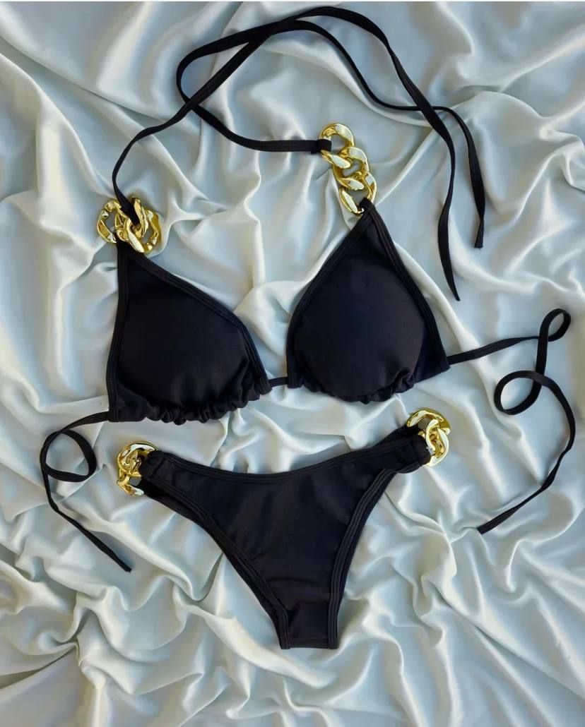 این بیکینی دوتیکه با طراحی خاص و زنجیرهای طلایی براق در قسمت سرشانه و دو طرف شورت، جلوهای لاکچری و متفاوت دارد. برای دیدن عکس تنخور اینجا کلیک کنید