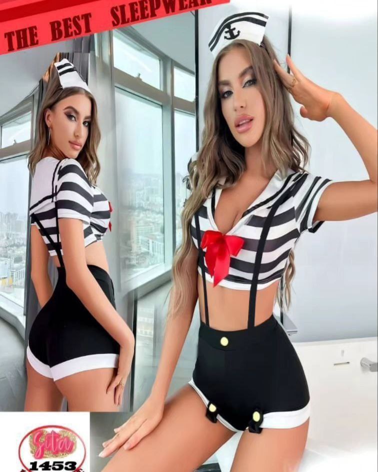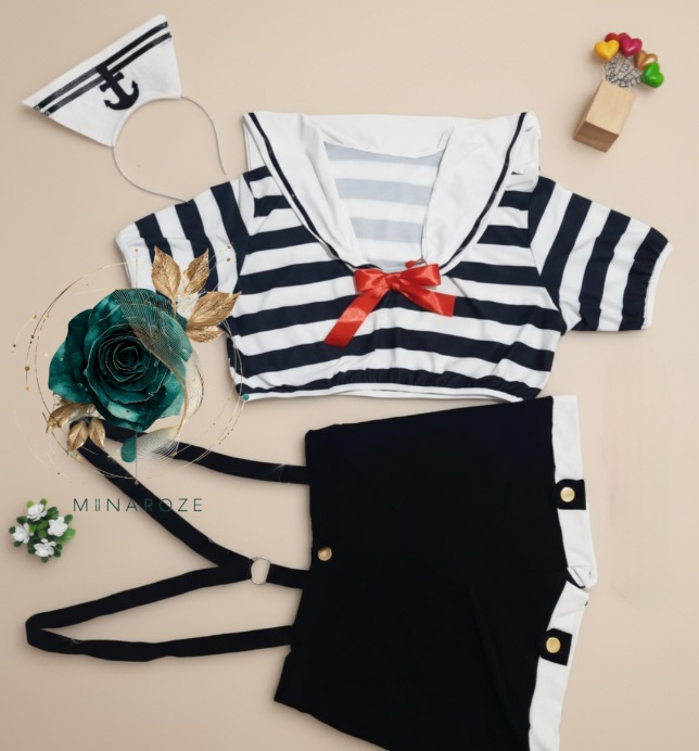 این ست فانتزی سهتکه ملوانی، با نیمتنهی کوتاه اسپرت، شورت پادار با ساسبندهای فانتزی و سربند ملوانی، تجسم طراوت دریا را به استایل شما میآورد. پارچه لطیف و خنک، برش حرفهای و رنگبندی متضاد مشکی و سفید، ظرافت و شادابی دریایی را بهزیبایی با جسارت و جذابیت ترکیب کرده است. برای دیدن عکس تنخور اینجا کلیک کنید