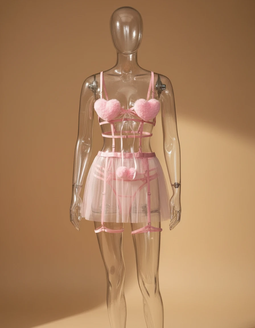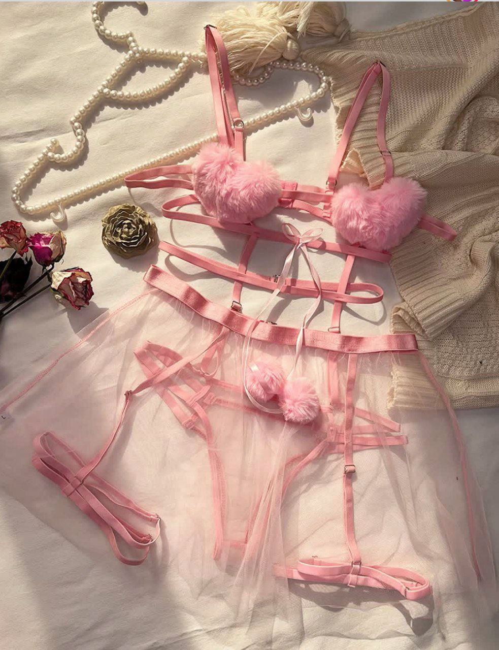 ست لباس زیر فانتزی تور شیشه‌ای و پوم‌پوم زنانه ۲ تکه کد 9015