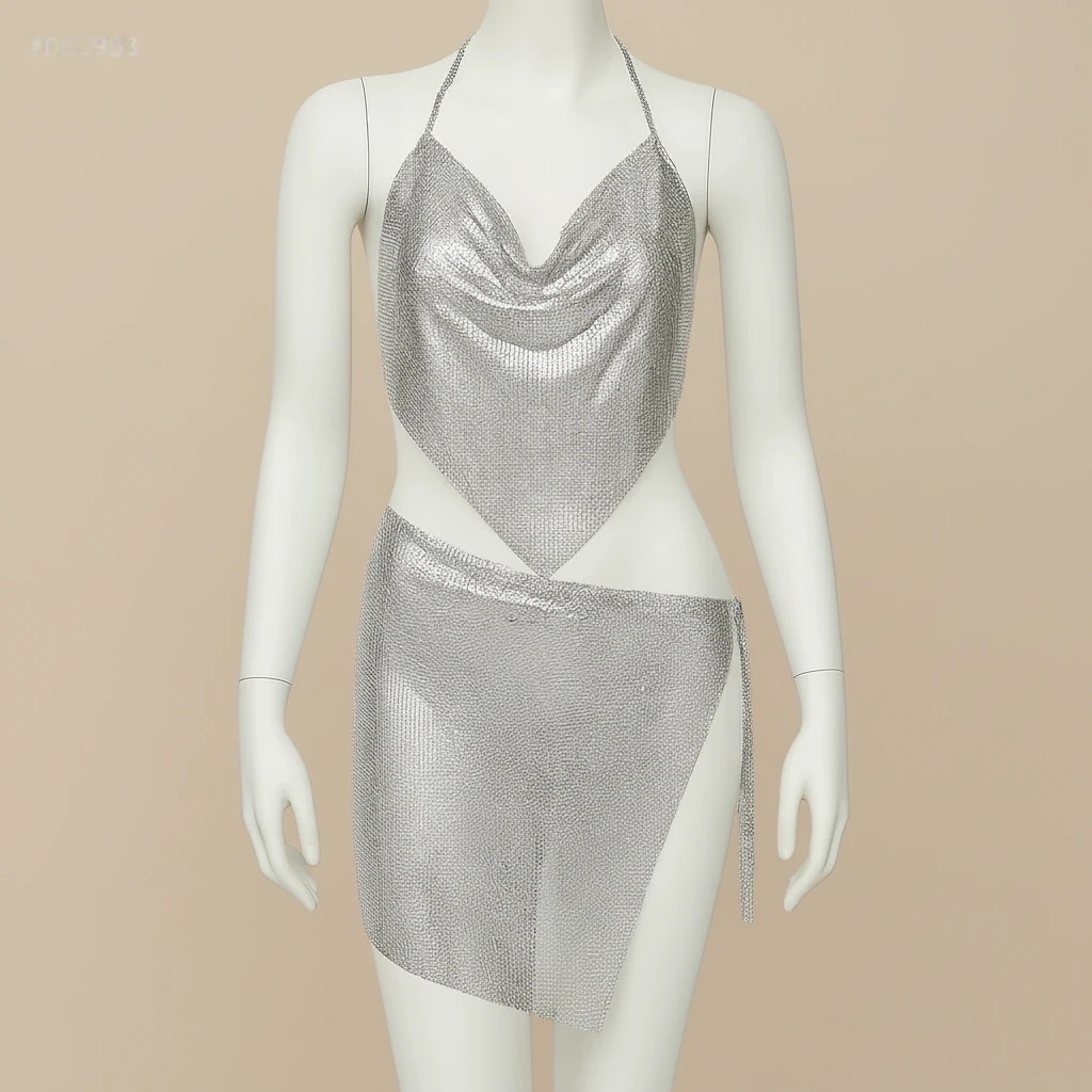 مدل تاپ: دکلته آزاد پشت باز، بند پشت سینه و دور گردن زنجیری رگلاژدار، پایین تاپ برش مثلثی