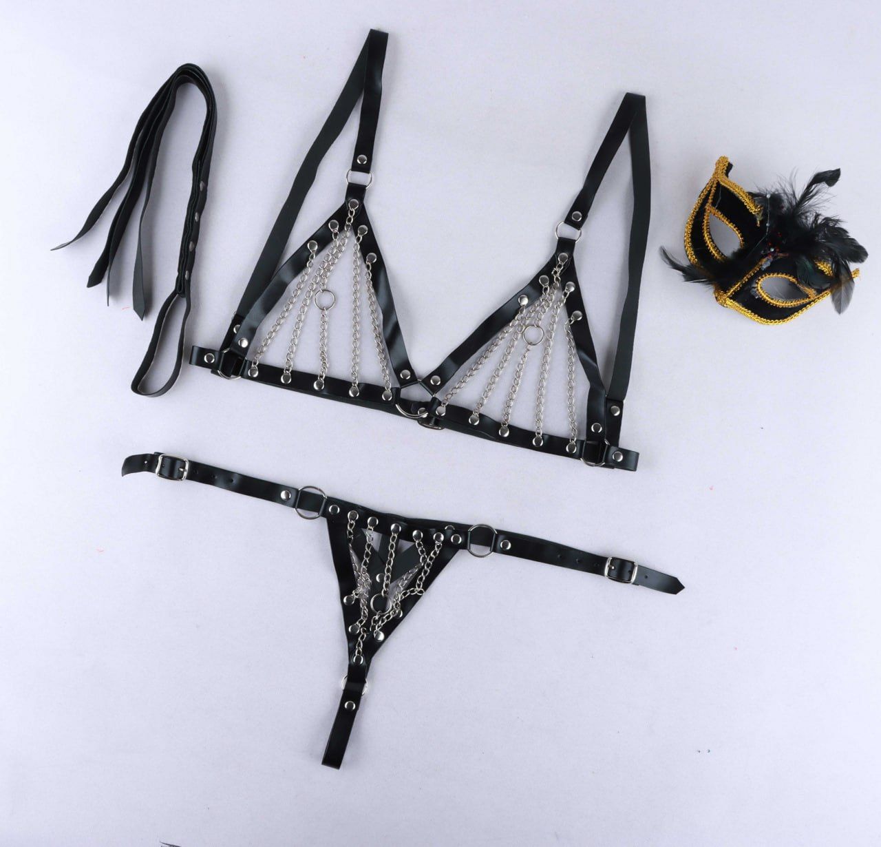 این ست سه تیکه شورت، سوتین و شلاق فانتزی چرم و زنجیر کد 9810 بوده و کیفیت عالی دارد. رنگ قرمز موجود نیست